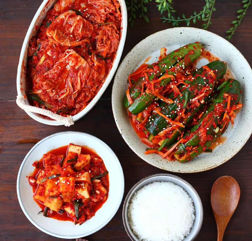 El Kimchi es un plato tradicional coreano cuyos componentes pueden variar, pero generalmente incluyen alguna combinación de vegetales, ajo, jengibre, chiles, sal y salsa de pescado. La mezcla se encurte y fermenta, lo cual originalmente era una manera de preservar los vegetales durante los meses de invierno. La col es el vegetal más comúnmente usado para hacer kimchi, aunque también se utilizan frecuentemente zanahorias, rábanos, pepinos y cebollines. Hay cientos de recetas de kimchi que varían dependiendo de la región y la temporada en la que se producen, y es muy fácil hacerlo un plato vegano manteniendo todos los ingredientes a base de plantas.