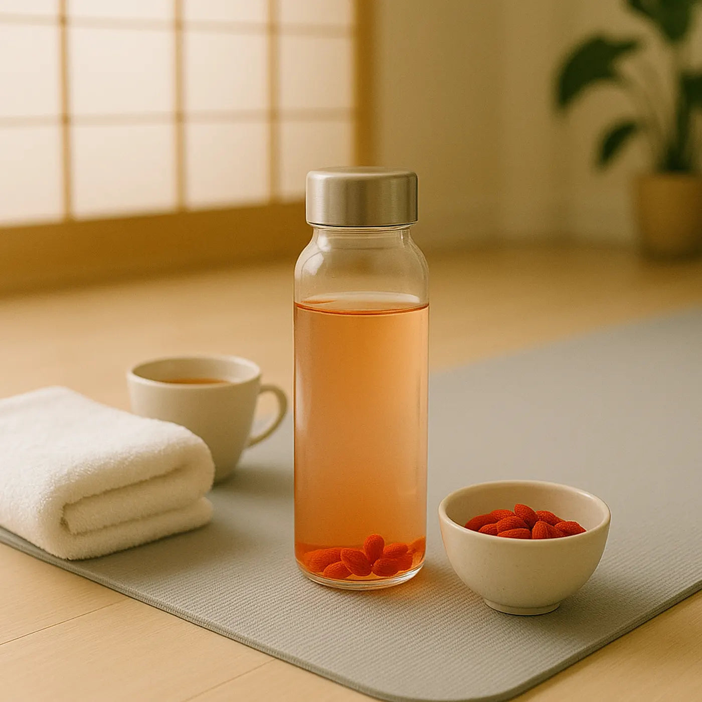 En una botella de agua tibia, las bayas liberan color y sabor suave: hidratación y micronutrientes de forma simple y real.
