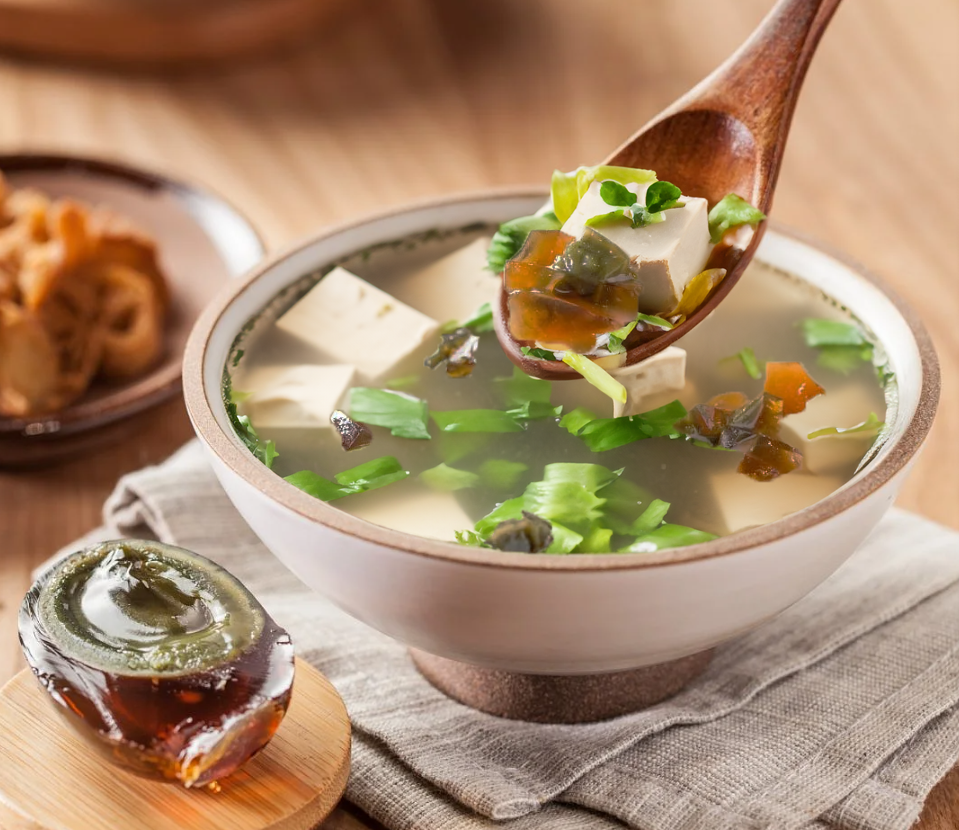 Com Tofu em Sopa de Ovo Centenário com Carne Magra